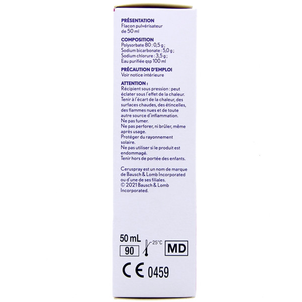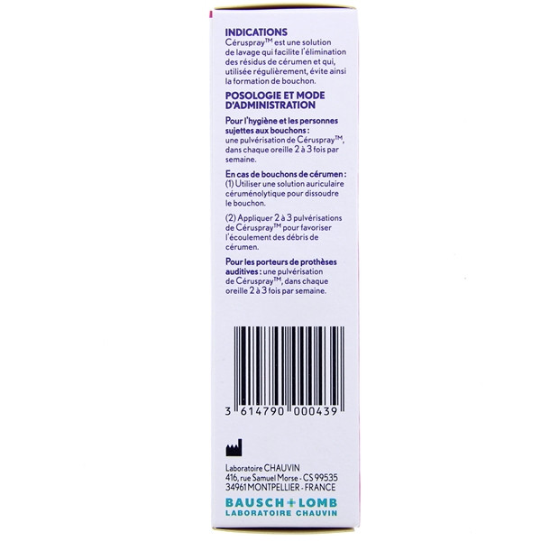 Bausch + Lomb Hygiène de l’oreille Ceruspray représente une solution de lavage ionique. Sa formule non agressive est enrichie d’ingrédients tensio-actifs qui ramollissent et dissolvent les amas de cérumen afin qu’ils puissent être évacués plus facilement. Par ailleurs, ce produit aide à éviter la formation de bouchons de cérumen. Il est recommandé aux personnes sujettes à une production abondante de cérumen, aux individus porteurs de prothèses auditives, à ceux qui emploient des bouchons anti-bruits ou utilisent un casque pour écouter de la musique. Cette solution est aussi conseillée à ceux qui travaillent dans un environnement poussiéreux ainsi qu’à celles qui sont exposées à des écarts de pression atmosphérique (alpinistes, plongeurs sous-marins...).