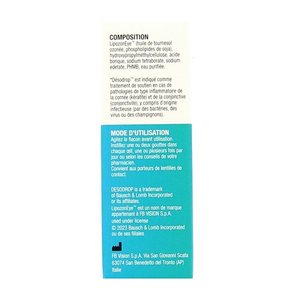Désodrop est une solution ophtalmique de 8 ml indiquée pour humidifier, protéger et apaiser la surface oculaire. Le produit a été élaboré à partir de l’hypromellose, de liposomes et de l’huile végétale de tournesol. Ces ingrédients contribuent à stabiliser la couche lipidique au niveau du film lacrymal, limitant ainsi l’assèchement de la couche aqueuse. Son application garantit alors un soulagement immédiat pour les yeux. Sachez que l’huile de tournesol a été ozonée pour être exempte de conservateurs. Le collyre de Chauvin Bausch + Lomb est également utilisé en cas d’inflammation oculaire causée par le stress mécanique, chirurgical, traumatique ou encore par l’environnement quotidien.