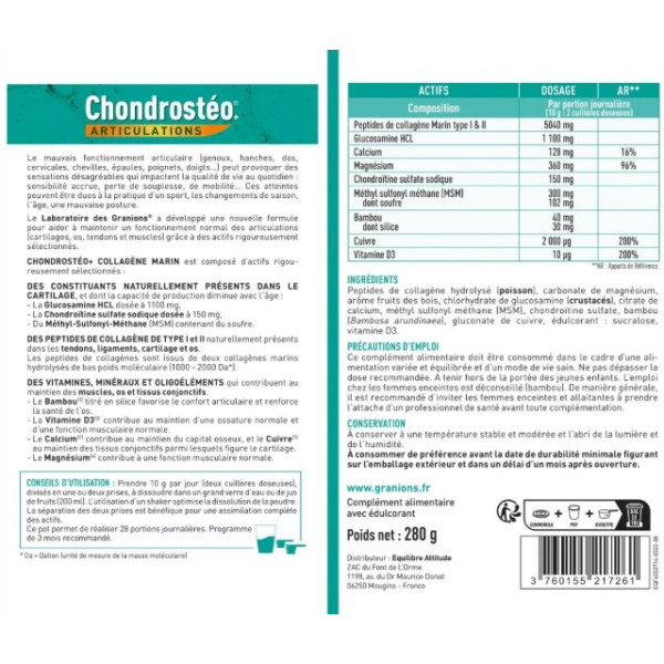 Peptides de collagène hydrolysé (poisson), carbonate de magnésium, arôme fruits des bois, chlorhydrate de glucosamine (crustacés), citrate de calcium, méthyl sulfonyl méthane (MSM), chondroïtine sulfate, bambou (Bambusa arundinaea), gluconate de cuivre, édulcorant : sucralose, vitamine D3.