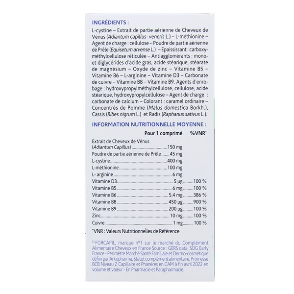 L-cystine – Extrait de partie aérienne de Cheveux de Vénus (Adiantum Capilllus – Veneris L.) – L-méthionine – Agent de charge : cellulose - Poudre de partie aérienne de Prêle (Equisetum Arvense L.) – Amidon modifié de pomme de terre - Antiagglomérant : mono- et diglycérides d’acide gras et acide stéarique - Oxyde de zinc - Vitamine B5 - Vitamine B6 – L- arginine - Vitamine D3 – Carbonate de cuivre - Vitamine B8 - Vitamine B9.