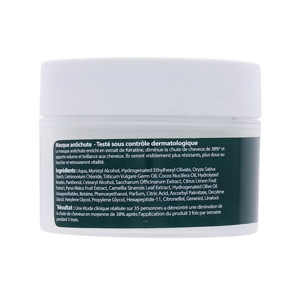 En plus des extraits de kératine, ce masque antichute contient des huiles végétales qui vont nourrir les cheveux en profondeur, les assouplir et les adoucir. Formulé également avec des extraits de thé vert et de pomme, ce soin capillaire est ainsi riche en antioxydant pour lutter contre les radicaux libres.