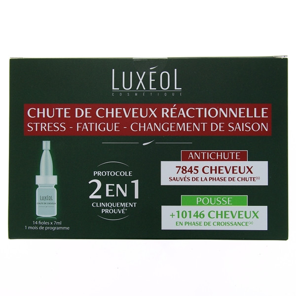 Luxéol chute de cheveux réactionnelle est un produit capillaire disponible en une boite de 14 fioles de 7 ml. Fabriqué en France, il est facile à manipuler grâce à sa forme en lotion qui est agréable au contact. Le traitement avec ce produit permet également d'obtenir un gain de temps considérable puisqu’il n’est pas nécessaire de le rincer.