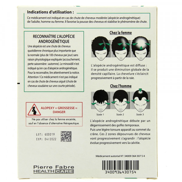 Ce médicament peut être utilisé sur les conseils de votre pharmacien. Néanmoins, un avis médical est nécessaire en cas de maladie cardiaque, même ancienne. Il n'est pas adapté aux chutes de cheveux brutales, consécutives à une maladie ou à un traitement médicamenteux. Il ne doit pas être appliqué ailleurs que sur le crâne.