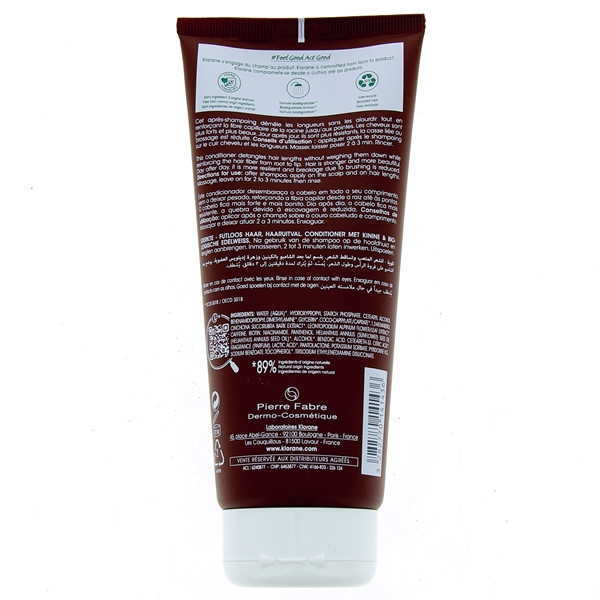 L'après-shampooing à la Quinine & Edelweiss, du laboratoire Klorane, est adapté pour les cheveux fatigués et aux chutes de cheveux. Disponible en tube de 200 ml.