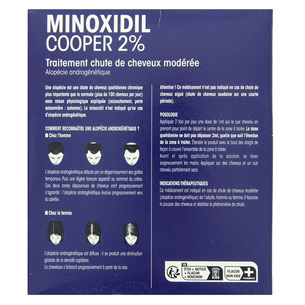 Ce médicament peut être utilisé sur les conseils de votre pharmacien. Néanmoins, un avis médical est nécessaire en cas de maladie cardiaque, même ancienne. Il n'est pas adapté aux chutes de cheveux brutales, consécutives à une maladie ou à un traitement médicamenteux. Il ne doit pas être appliqué ailleurs que sur le crâne.