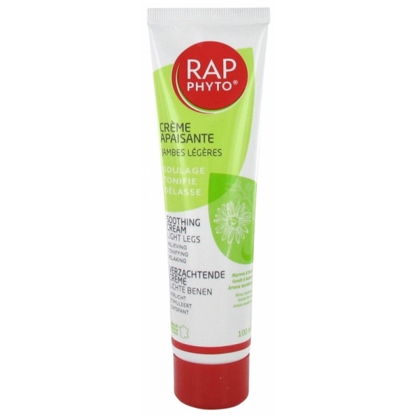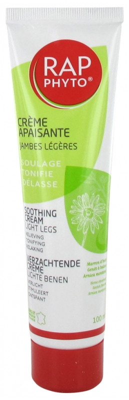 La crème apaisante spéciale pour jambes lourdes Rap Phyto. Disponible sous forme de tube de 100 ml. Cette crème est spécialement formulée pour délasser les jambes fatiguées, via un massage prolongé, et retrouver des jambes légères. Grâce à l'action de ses 3 agents naturels, ce soin soulage et tonifie les jambes lourdes, tout en procurant confort et légèreté dans la journée. Le Genêt à balai, un vasoconstricteur, et le Marron d’Inde, un vasculo-protecteur, améliorent la circulation sanguine. L'Arnica Montana renferme des vertus anti-inflammatoires.