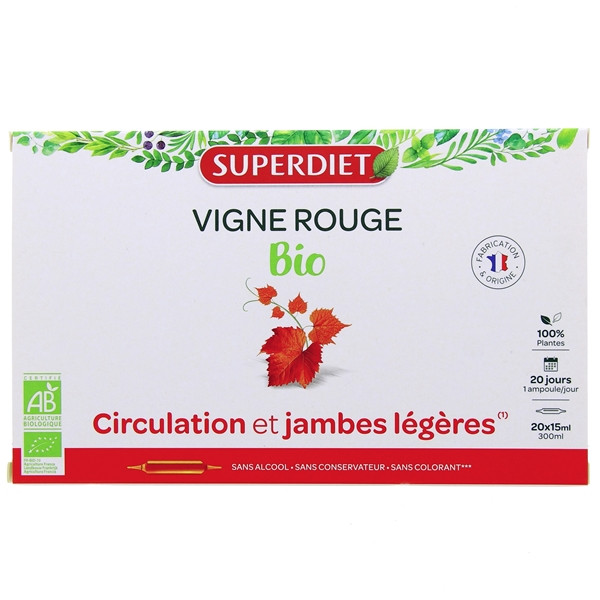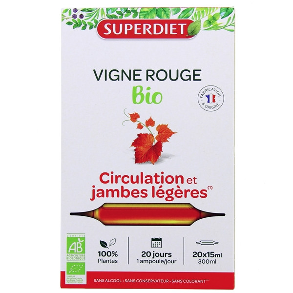 Le complément alimentaire Vigne Rouge Bio de la marque Superdiet est un produit indiqué en cas de troubles circulatoires.
