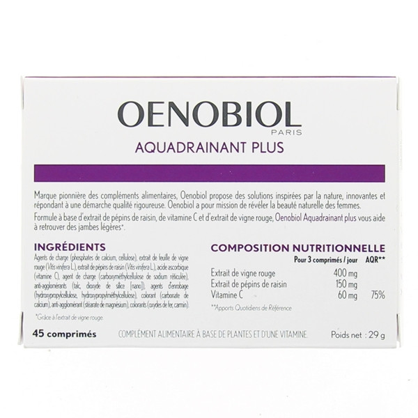 Oenobiol Aquadrainant Plus est un complément alimentaire aux extraits naturels (extraits de vigne rouge et de pépins de raisins) pour retrouver des jambes légères.