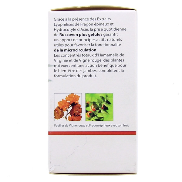 Grâce à la présence des Extraits Lyophilisés de Fragon épineux et Hydrocotyle d'Asie, la prise quotidienne de Ruscoven plus gélules garantit un apport de principes actifs naturels utiles pour favoriser la fonctionnalité de la microcirculation.