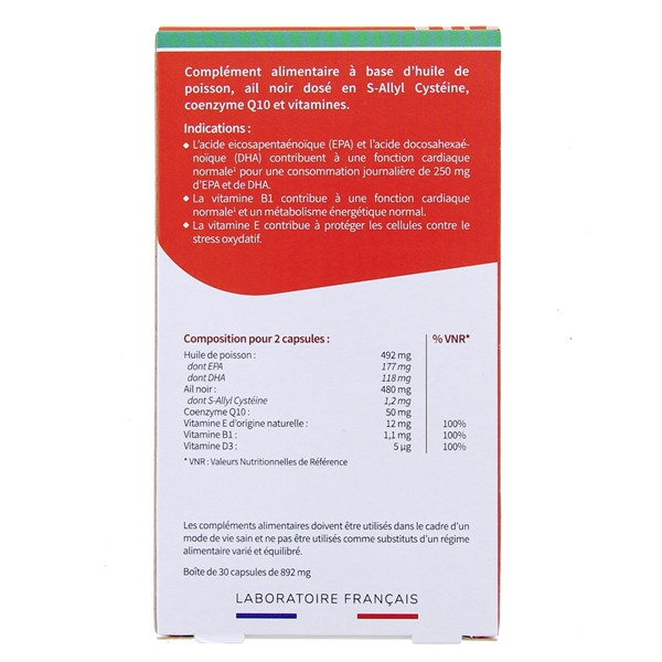 Huile de poisson dosée en acide eicosapentaénoïque (EPA) et acide docosahexaénoïque (DHA), extrait de bulbe d'ail noir (allium sativum L.) dosé en S-allyl cystéine obtenu par viellissement naturel, tunique : gélatine de peau de poisson, humectant : glycérol, anti-agglomérant : huile de tournesol, épaississant : mono et diglycérides d'acides gras, coenzyme Q10 Kaneka Q10TM obtenue par biofermentation (ne contient pas de levure), émulsifiant : lécithine de tournesol, D-alpha tocophérol d'origine naturelle (vitamine E), mononitrate de thiamine (vitamine B1), cholécalciférol (vitamine D3).