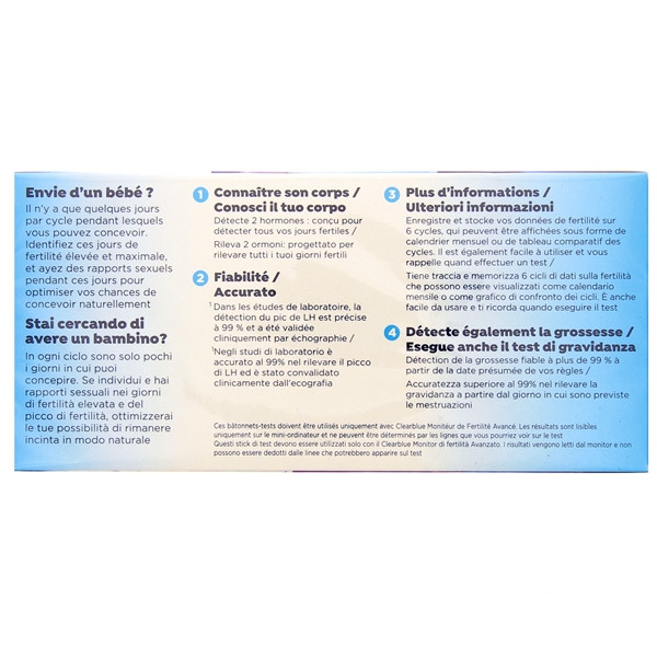 Disponible en boîte contenant 20 tests de fertilité et 4 tests de grossesse.