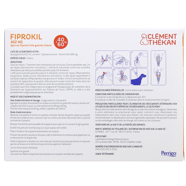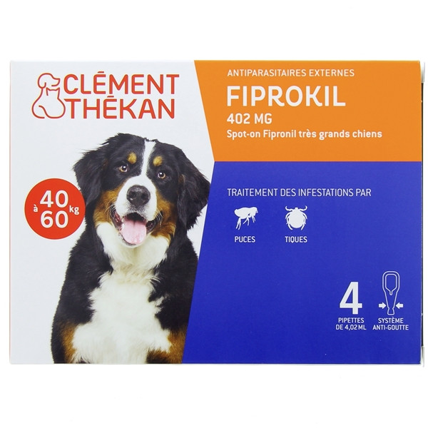 Les laboratoires Clément Thékan développent pour le chien ou la chienne, pesant entre 40 et 60 kg, le soin vétérinaire Fiprokil. Proposé en boîte de 4 pipettes de 4,02 ml.