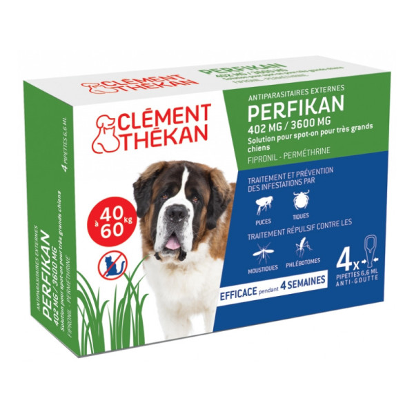 Perfikan très grands chiens 402mg/3600mg est présenté en boîte de 4 pipettes de 6,60 ml.
