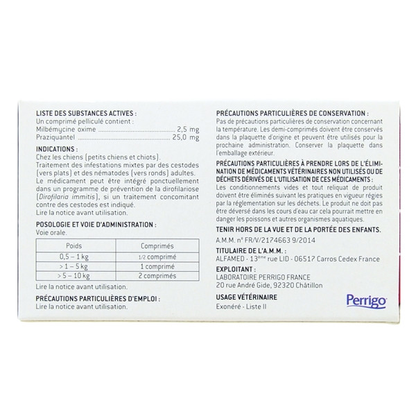 - Posologie : 0,5-1 kg : ½ comprimé ; 1-5 kg : 1 comprimé ; 5-10 kg : 2 comprimés.