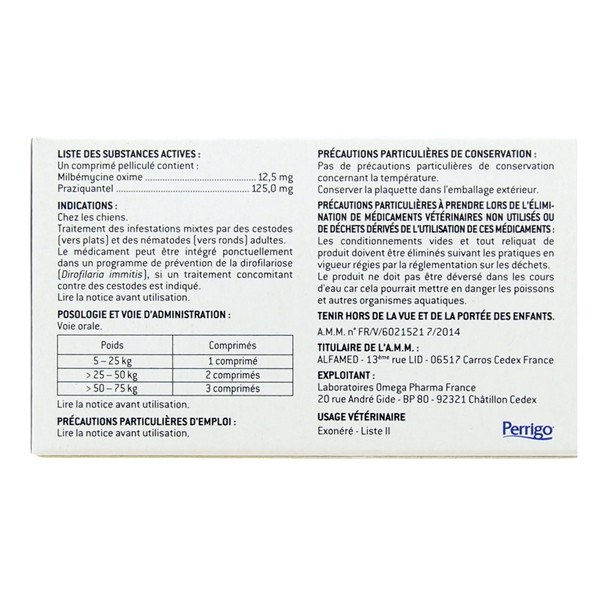 - Posologie : 5-25 kg : 1 comprimé ; 25-50 kg : 2 comprimés ; 50-75 kg : 3 comprimés.