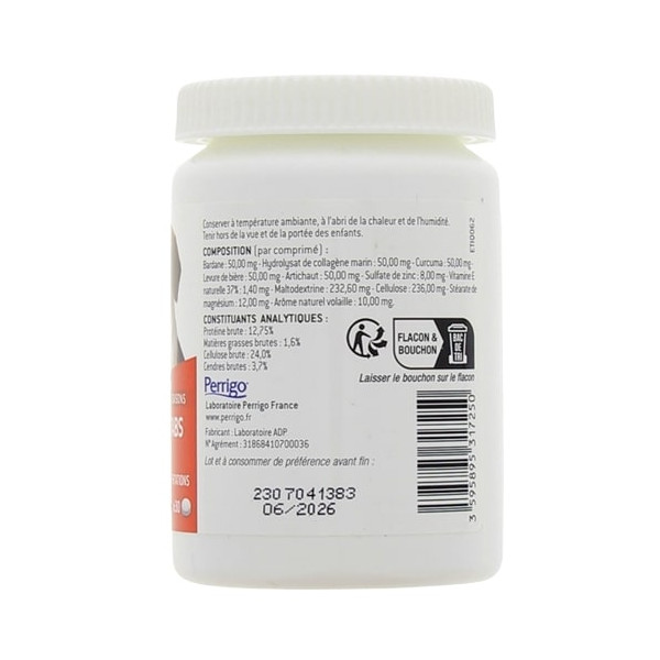 Bardane : 50,00 mg —Hydrolysat de collagène marin : 50,00 mg —Curcuma : 50,00 mg —Levure de bière : 50,00 mg —Artichaut : 50,00 mg —Sulfate de zinc : 8,00 mg —Vitamine E naturelle 37 % : 1,40 mg —Maltodextrine : 232,50 mg —Cellulose : 236,00 mg —Stéarate de magnésium : 12,00 mg —Arôme naturel volaille : 10,00 mg.