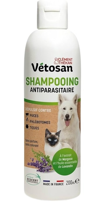Vétosan Shampooing Antiparasitaire pour chien et chat de Clément Thékan est formulé à base d'extrait de margosa et d'huile essentielle de lavandin pour repousser efficacement les puces, les tiques et les phlébotomes.