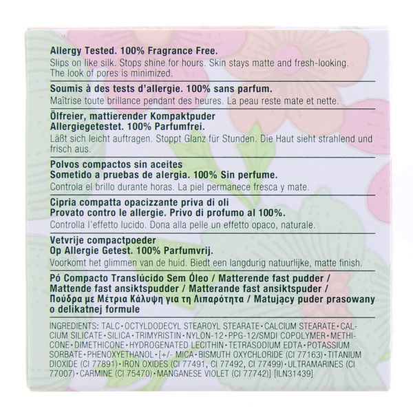 Talc, Octyldodecyl Stearoyl Stearate, Calcium Stearate, Calcium Silicate, Silica, Trimyristin, Nylon-12, Ppg-12/Smdi Copolymer, Methicone, Dimethicone, Hydrogenated Lecithin, Tetrasodium Edta, Potassium Sorbate, Phenoxyethanol, [+/—Mica, Bismuth Oxychloride (Ci 77?163), Titanium Dioxide (Ci 77?891), Iron Oxides (Ci 77491, Ci 77492, Ci 77?499), Ultramarines (Ci 77?007), Carmine (Ci 75?470), Manganese Violet (Ci 77?742)]