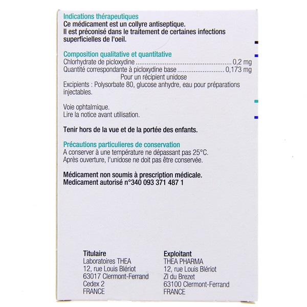 Chlorhydrate de picloxydine 0.20 mg (quantité correspondante à picloxydine base 0.173 mg). Excipients : polysorbate 80, glucose anhydre, eau purifiée.