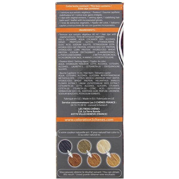 - Grâce aux propriétés tonifiantes et purifiantes des huiles essentielles, de Romarin et d'Eucalyptus, ce produit offre une coloration parfaite des cheveux. Au final, ils deviennent soyeux et doux.
