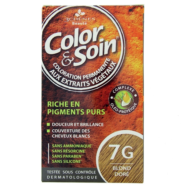 Color & Soin Blond doré 7G des Laboratoires Les 3 chênes garantit une coloration permanente du cheveu grâce à une teneur en huiles essentielles et en protéines végétales. Disponible en flacon de 60 ml avec étui et fixateur de couleur.