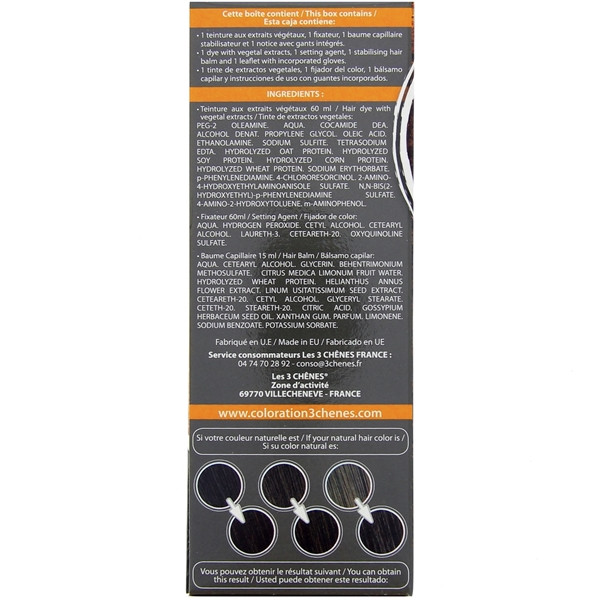 Les actifs qui constituent le soin coloration Soin & Color du laboratoire Les 3 chênes camouflent les cheveux blancs, teignent, donnent de l'éclat et du volume à l'ensemble de la chevelure.