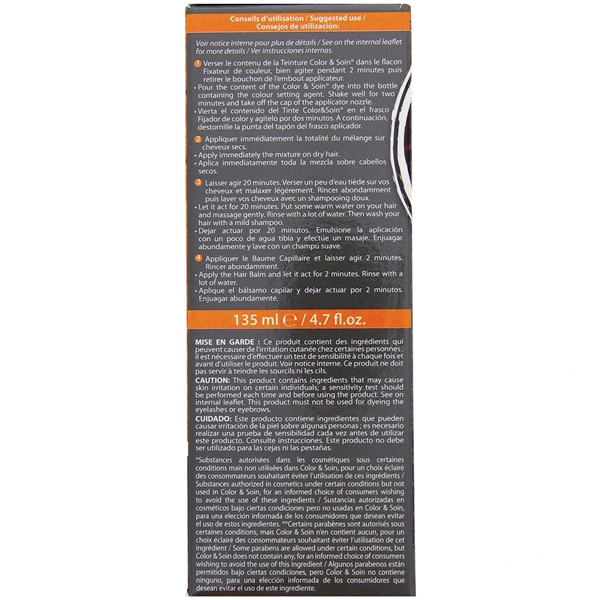 La teinture permanente Color & Soin Rouge flamboyant 10R avec sa teneur en huiles essentielles et en protéines végétales, constitue un soin capillaire efficace. Disponible dans une boîte en carton, contenant un flacon-fixateur de 60 ml, un baume capillaire de 15 ml et des gants.
