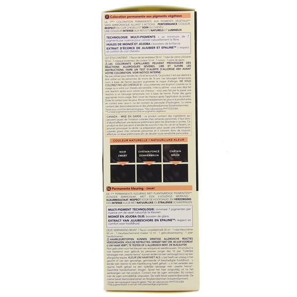 Phytocolor noir n°1 est un soin de coloration permanente adapté à tous les types de cheveux. Cette coloration offre une couleur intense aux reflets naturels et lumineux. Les pigments végétaux colorent les cheveux sans risques d'agressions en alliant 3 actions :
