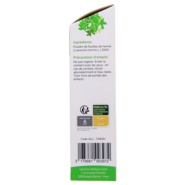 Boîte de 200 g contenant des feuilles séchées de henné naturel en poudre.