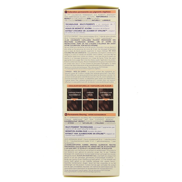 La coloration permanente de la gamme Phytocolor n°4.77 Châtain marron profond contient plusieurs pigments végétaux aux propriétés hydratantes, protectrices et naturellement colorantes.