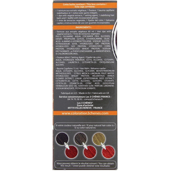 Les actifs qui constituent le soin coloration Soin & Color du laboratoire Les 3 chênes camouflent les cheveux blancs, teignent, donnent de l'éclat et du volume à l'ensemble de la chevelure.