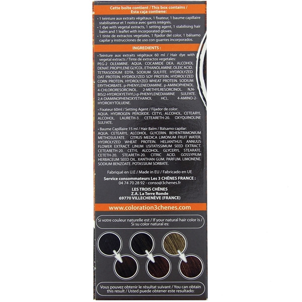 Les actifs qui constituent le soin coloration Soin & Color du laboratoire Les 3 chênes camouflent les cheveux blancs, teignent, donnent de l'éclat et du volume à l'ensemble de la chevelure.