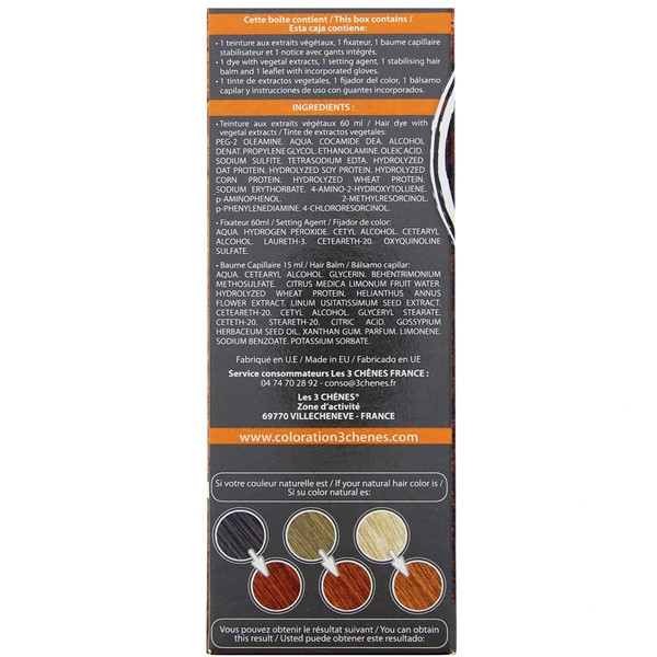 - Grâce aux propriétés tonifiantes et purifiantes des huiles essentielles, de Romarin et d'Eucalyptus, ce produit offre une coloration parfaite des cheveux. Au final, ils deviennent soyeux et doux.