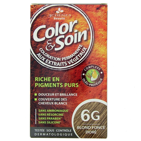Color & Soin Blond foncé doré 6G des Laboratoires Les 3 chênes garantit une coloration permanente du cheveu grâce à une teneur en huiles essentielles et en protéines végétales. Disponible en flacon de 60 ml avec étui et fixateur de couleur.
