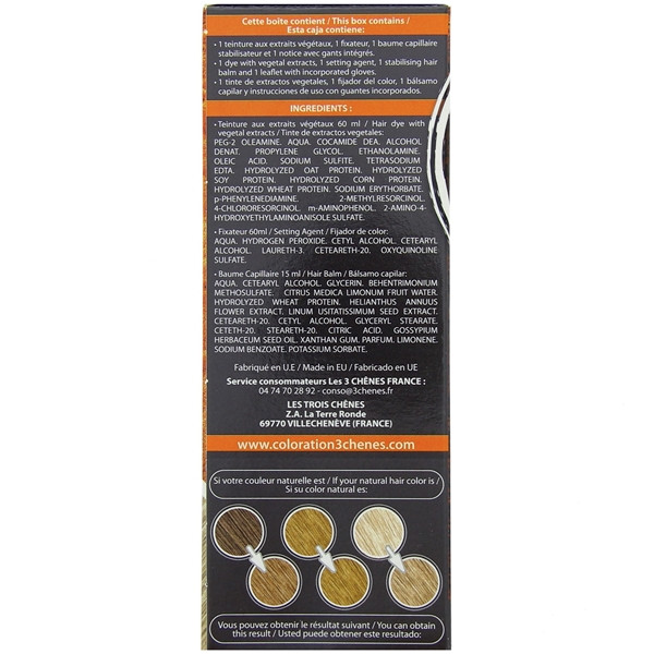 - Grâce aux propriétés tonifiantes et purifiantes des huiles essentielles, de Romarin et d'Eucalyptus, ce produit offre une coloration parfaite des cheveux. Au final, ils deviennent soyeux et doux.