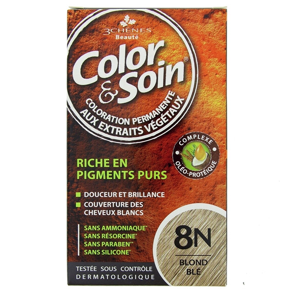 Color & Soin Blond blé 8N des Laboratoires Les 3 chênes garantit une coloration permanente du cheveu grâce à une teneur en huiles essentielles et en protéines végétales. Disponible en flacon de 60 ml avec étui et fixateur de couleur.