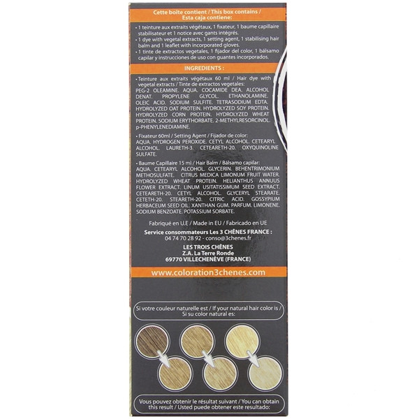 - Grâce aux propriétés tonifiantes et purifiantes des huiles essentielles, de Romarin et d'Eucalyptus, ce produit offre une coloration parfaite des cheveux. Au final, ils deviennent soyeux et doux.