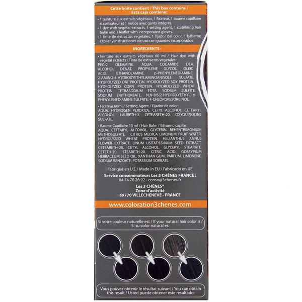 Peg-2 Oleamine. Aqua Purificata (Purified Water). Cocamide Dea. Alcohol Denat (ALCOHOL). Propylene Glycol. Ethanolamine. Oleic Acid. Tetrasodium Edta. Sodium Sulfite. Hydrolyzed Vegetable Protein (Triticum Vulgare, Soy, Corn, Avena Sativa). Sodium Erythorbate. P-Phenylenediamine. P-Aminophenol. 4-Chlororesorcinol 2-Methylresorcinol. N,N-Bis (2-Hydroxyethyl)-p-Phenylenediamine Sulfate. 2,4-Diaminophenoxyethanol Hcl. 4-Amino-2-Hydroxytoluene. Formulé sans : paraben, silicone, résorcine, ammoniaque.