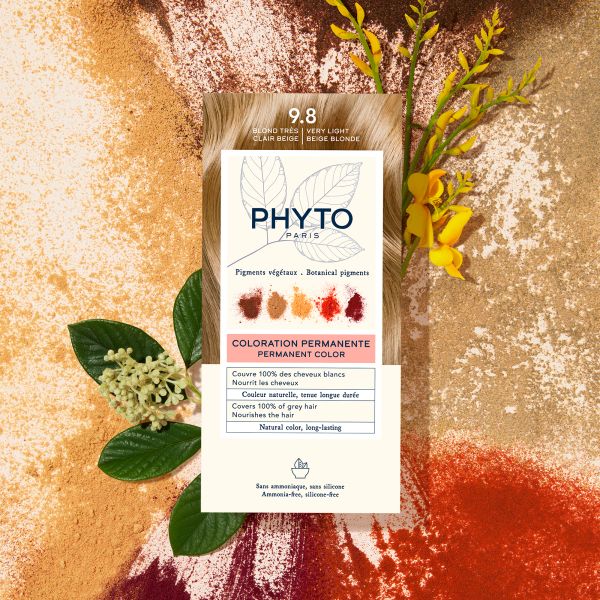 Phytocolor Blond Très Clair Beige n°9.8 est un soin de coloration permanente adapté à tous les types de cheveux. Cette coloration offre une couleur intense aux reflets naturels et lumineux. Les pigments végétaux colorent les cheveux sans risques d'agressions en alliant 3 actions :