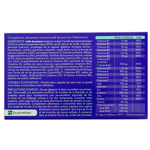 Huile De Poisson Dosée En Oméga 3 (Acide Docosahexaénoïque (DHA) Et Acide Eicosapentaénoïque (EPA)), Phosphate De Calcium Et D’hydrogène Anhydre (Calcium), Enveloppe De La Capsule (Gélatine D’origine Bovine ; Humectants : Sorbitol, Glycérine ; Colorants : Oxyde De Fer Noir, Oxyde De Fer Rouge [Nano]), Carbonate De Calcium (Calcium), Acide L-Ascorbique (Vitamine C), Huile De Carthame Raffinée, Bisglycinate Ferreux (Fer), Emulsifiant : Lécithine De Tournesol, Taurine, Acétate De DL-Alpha Tocophéryl (Vitamine E), Nicotinamide (Vitamine B3), Oxyde De Zinc (Zinc), D-Pantothénate De Calcium (Vitamine B5), Palmitate De Rétinyl (Vitamine A), Sulfate De Cuivre (Cuivre), Cyanocobalamine (Vitamine B12), Chlorhydrate De Pyridoxine (Vitamine B6), Riboflavine (Vitamine B2), Mononitrate De Thiamine (Vitamine B1), Acide [6S]-5-Méthyltétrahydrofolique Sous Forme De Sel De Glucosamine (Quatrefolic®) (Vitamine B9), Iodate De Potassium (Iode), Cholécalciférol (Vitamine D3), D-Biotine (Vitamine B8), Sélénite De Sodium (Sélénium).