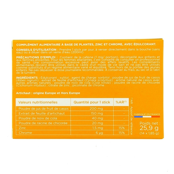 Xylitol ; sorbitol ; poudre de jus de fruits de cassis (Ribes nigrum) ; extrait de feuille d’artichaut (Cynara scolymus) ; arôme naturel de cassis avec autres arômes naturels ; poudre de noix de cola (Cola nitida) ; poudre de racine de chicorée (Cichorium intybus) ; citrate de zinc ; picolinate de chrome.