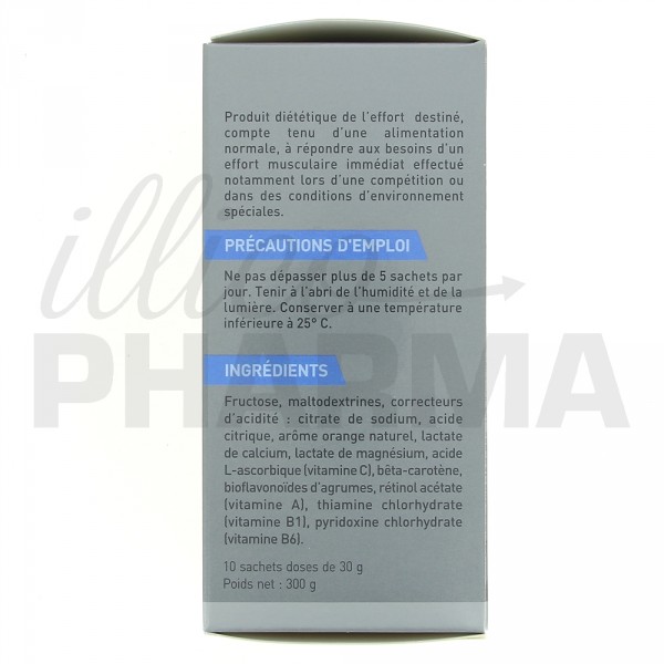 Fructose 22,5 g, maltodextrines 2,7 g, correcteurs d'acidité citrate de Na et acide citrique, arôme orange naturel, lactate de Ca soit Ca 60 mg, lactate de Mg soit Mg 39 mg, acide L-ascorbique soit vitamine C 10,5 mg, bêtacarotène 0,3 mg, bioflavonoïdes d'agrumes, rétinol acétate soit vitamine A 0,15 mg, thiamine chlorhydrate soit vitamine B1 0,3 mg, pyridoxine chlorhydrate soit vitamine B6 0,3 mg, excipients qsp un sachet.