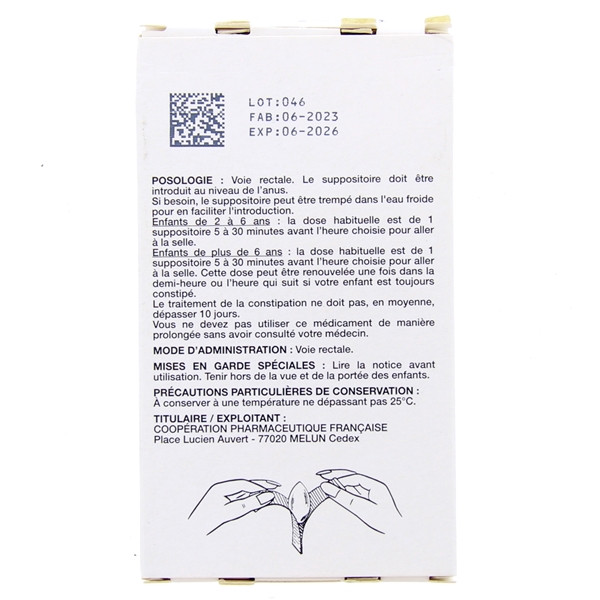 - Enfant de plus de 6 ans : 1 suppositoire Enfant par jour, à renouveler dans l'heure qui suit en cas de constipation rebelle.