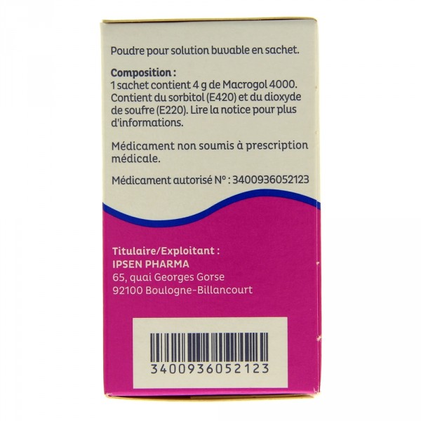 | Macrogol (polyéthylèneglycol) 4000 | 4 g | 10 g |