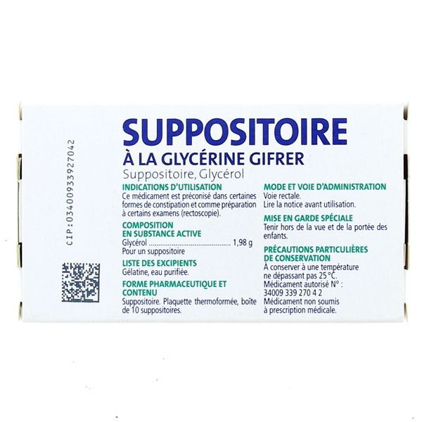 Disponible en boîte de 10 suppositoires à la glycérine.