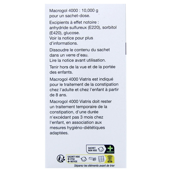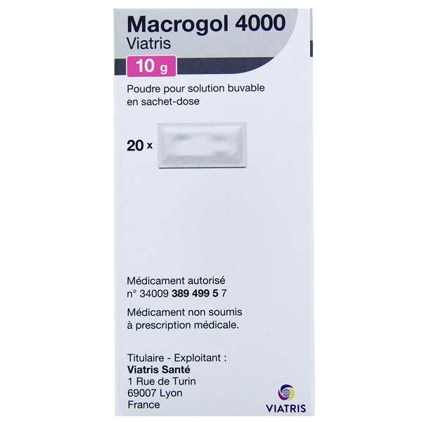 Macrogol 4000 est un médicament non soumis à prescription médicale du laboratoire Viatris. Macrogol 4000 est un médicament laxatif indiqué en cas de constipation.