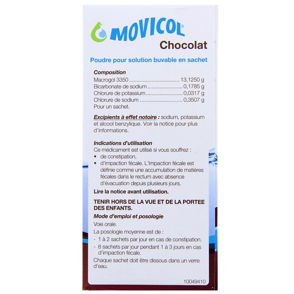 Movicol est une poudre pour solution buvable en sachet indiqué dans le traitement de la constipation ou de l'impaction fécale chez l'adulte.