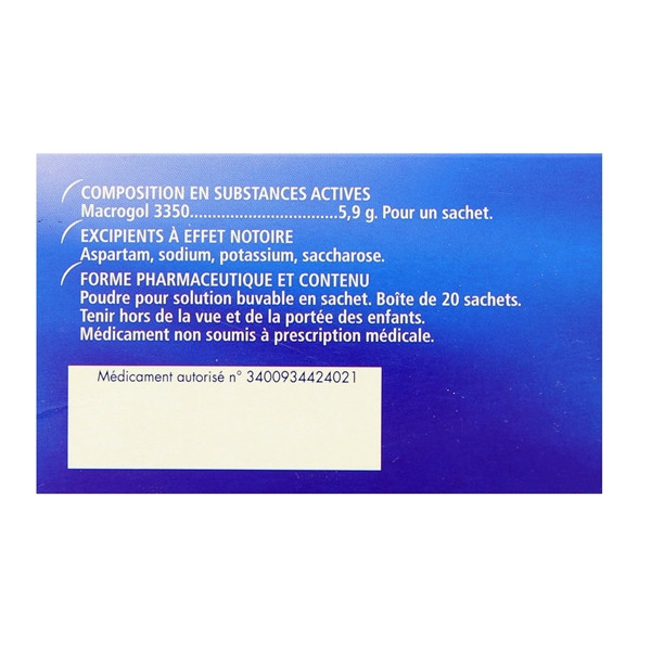 | Macrogol (polyéthylèneglycol) 3350 | 2,95 g | 5,9 g |
