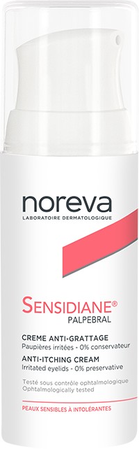 Soin quotidien ANTIGRATTAGE du contour des YEUX, adapté aux peaux SENSIBLES, SECHES, FRAGILISEES et IRRITEES, afin de faire disparaître les signes de fatigue, de lisser les rides, de réduire les poches et d'estomper les marques des cernes. La crème anti-grattage Sensidiane palpebral de Noreva est disponible en tube de 20ml.