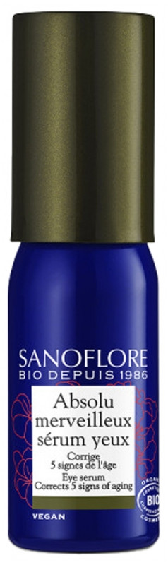 Absoulu Merveilleux Sérum Yeux Bio des laboratoires Sanoflore est un soin utilisé pour corriger les 5 signes de l'âge du regard : Ridules, rides de la patte d'oie, rides sous les yeux, poches et fermeté.